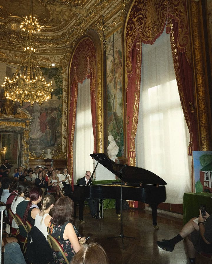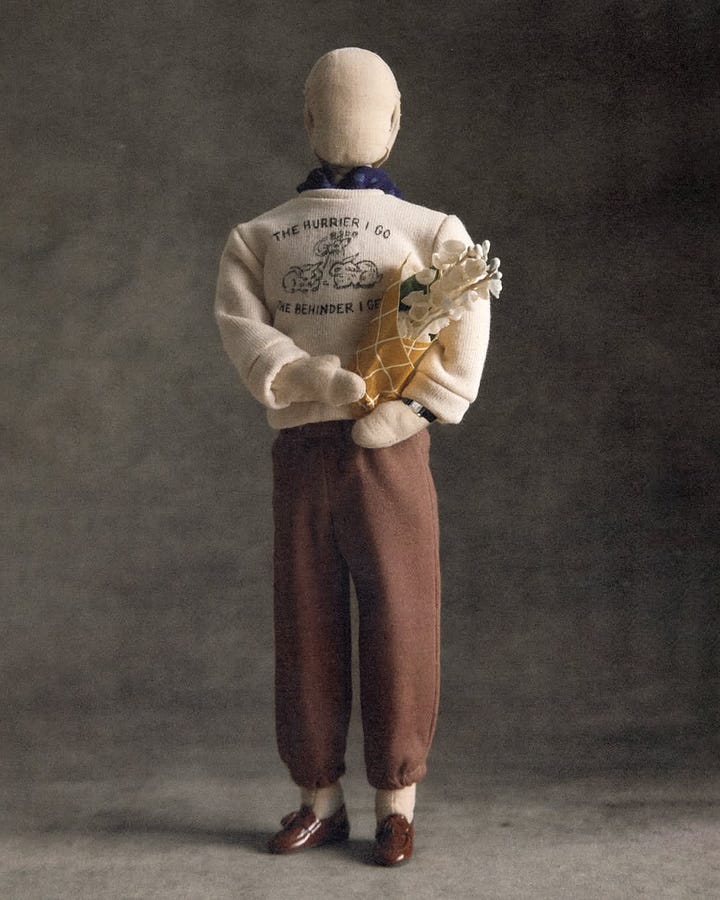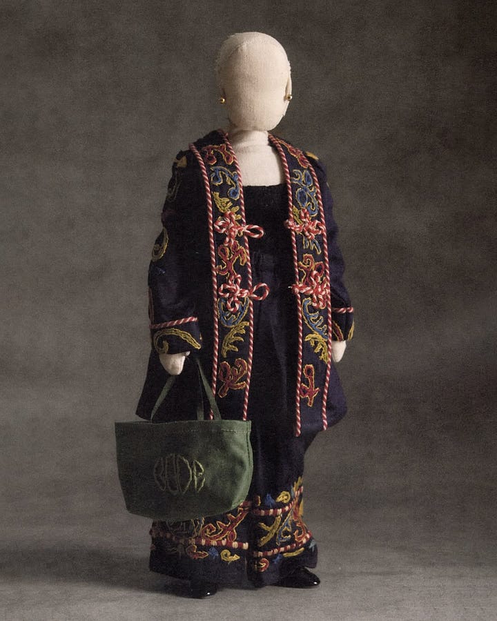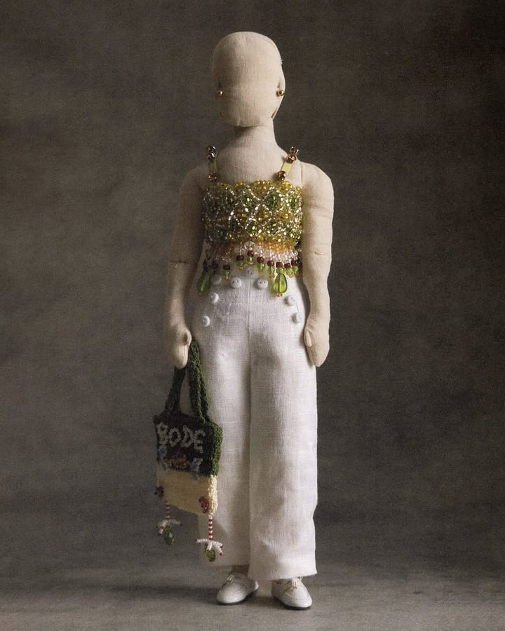 At Bode, miniature dolls dressed in the SS25 collection stood in formation inside the grand National Opera theatre. Apart from the music we were serenaded with (see Instagram post for more details), it was these dolls like little metaphors for our daily lives (I found my spirit doll in one ready to go to the beach with flowers and a lace top worn over a bikini) that made sense for a Bode spectacle. Aaron and Emily Bode are new parents. Perhaps mini is metaphor. A symbol of shrinking time, attention spans, or just the way you start seeing the world when you're raising someone pocket-sized.